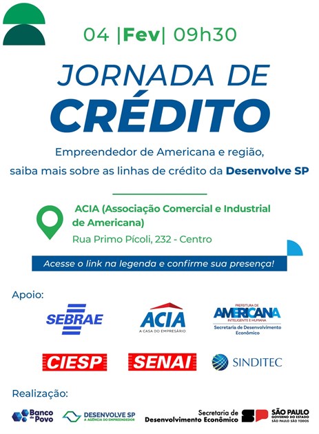 No dia 4 de fevereiro (quarta-feira) às 9h30, acontece a Jornada de Crédito para Empreendedores, na ACIA - Americana.