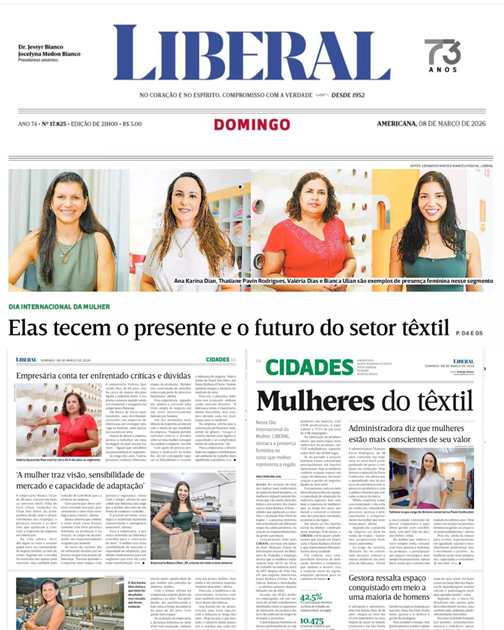 No Dia das Mulheres, o Jornal O Liberal publicou uma matéria sobre a presença feminina no setor têxtil da nossa região. A reportagem foi de Ana Carolina Leal e trouxe entrevistas com Bianca Ulian (presidente do JET do Sinditec), Valeria Dias e Ana Karina Dian (que fazem parte da diretoria e Conselho Consultivo do Sinditec).