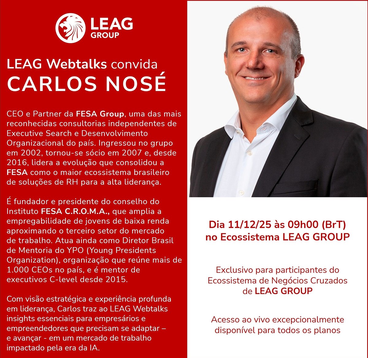 Não é necessário inscrição! Acesse pelo banner do evento em conteúdos cruzados de LEAG GROUP e participe!