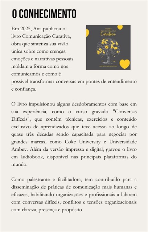 Em 2025, Ana publicou o livro Comunicação Curativa, obra que sintetiza sua visão única sobre como crenças, emoções e narrativas pessoais moldam a forma como nos comunicamos e como é possível transformar conversas em pontes de entendimento e confiança.